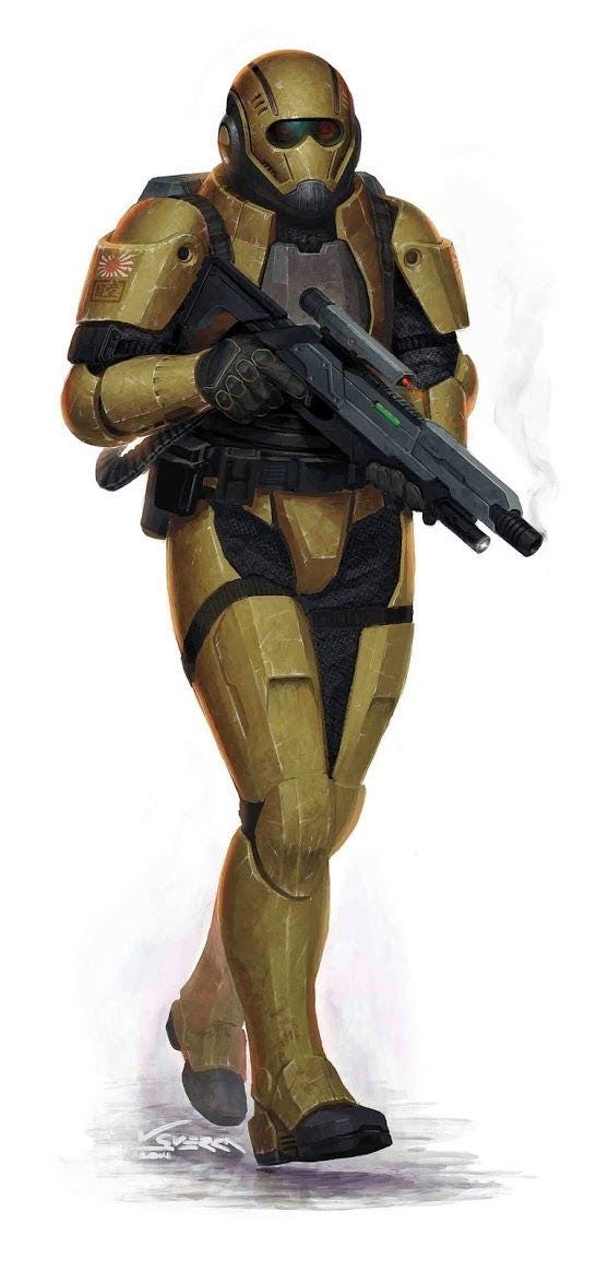 Saitama however, was a rookie; assigned to one of the newly-formed rifle platoons, his job to hold the line, guard the flanks of these same heavy weapons teams. The battle soon raged on every street, each emptied of civilians reinforced building was turned into an improvised bunker, defended by a dozen or so Shimazu troops. Lightly armored and armed, nevertheless their power armor support platoon took to the streets, slaughtering a multitude of Alduri soldiers and blowing up their vehicles.
